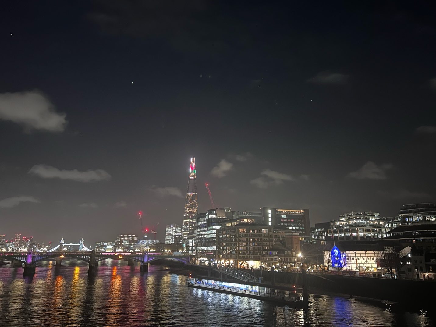 Globe Theatre to the right, with The Shard rising center, and lighted Tower Bridge downriver. Photo: David Yearsley.