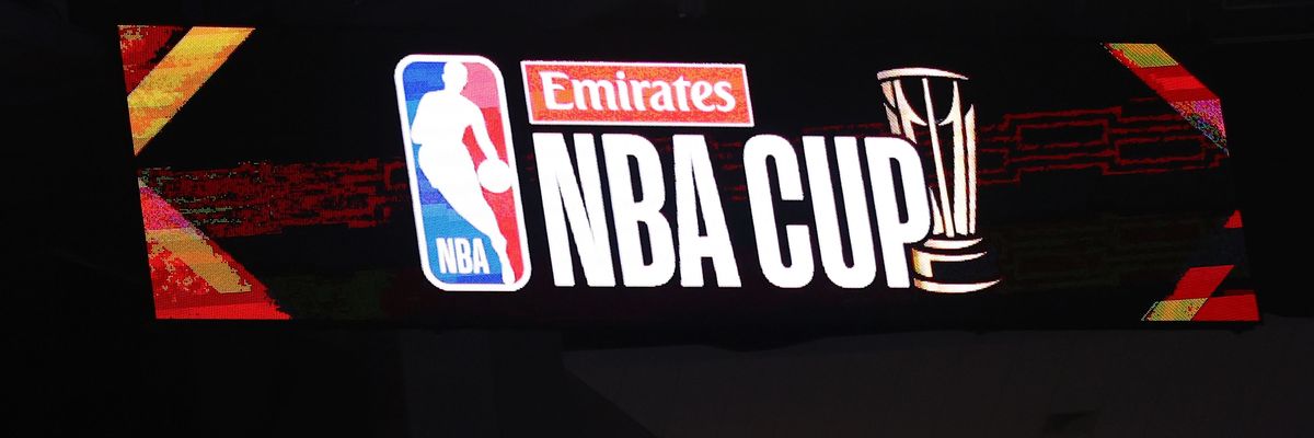 A detailed view of the NBA Emirates Cup sign is seen during a game between the Milwaukee Bucks and the Toronto Raptors at Fiserv Forum on November 12, 2024 in Milwaukee, Wisconsin.