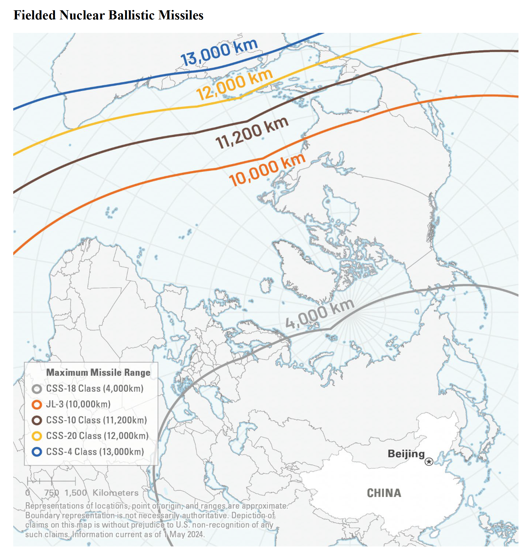 As part of its nuclear triad’s sea leg, China has now fielded the Julang-3 (JL-3/Great Wave-3) (CSS-N-20) SLBM on its Jin-class (Type 094) SSBNs. The Pentagon’s 2025 report assesses the JL-3 at roughly 10,000 km range, enabling strikes on large portions of the Continental United States (CONUS) from suitable patrol areas. The report’s aforementioned “Fielded Nuclear Ballistic Missiles” figure depicts the JL-3’s 10,000 km range covering Washington, DC and most of the continental United States (CONUS), with the exception of Florida and a swath of the southeast.