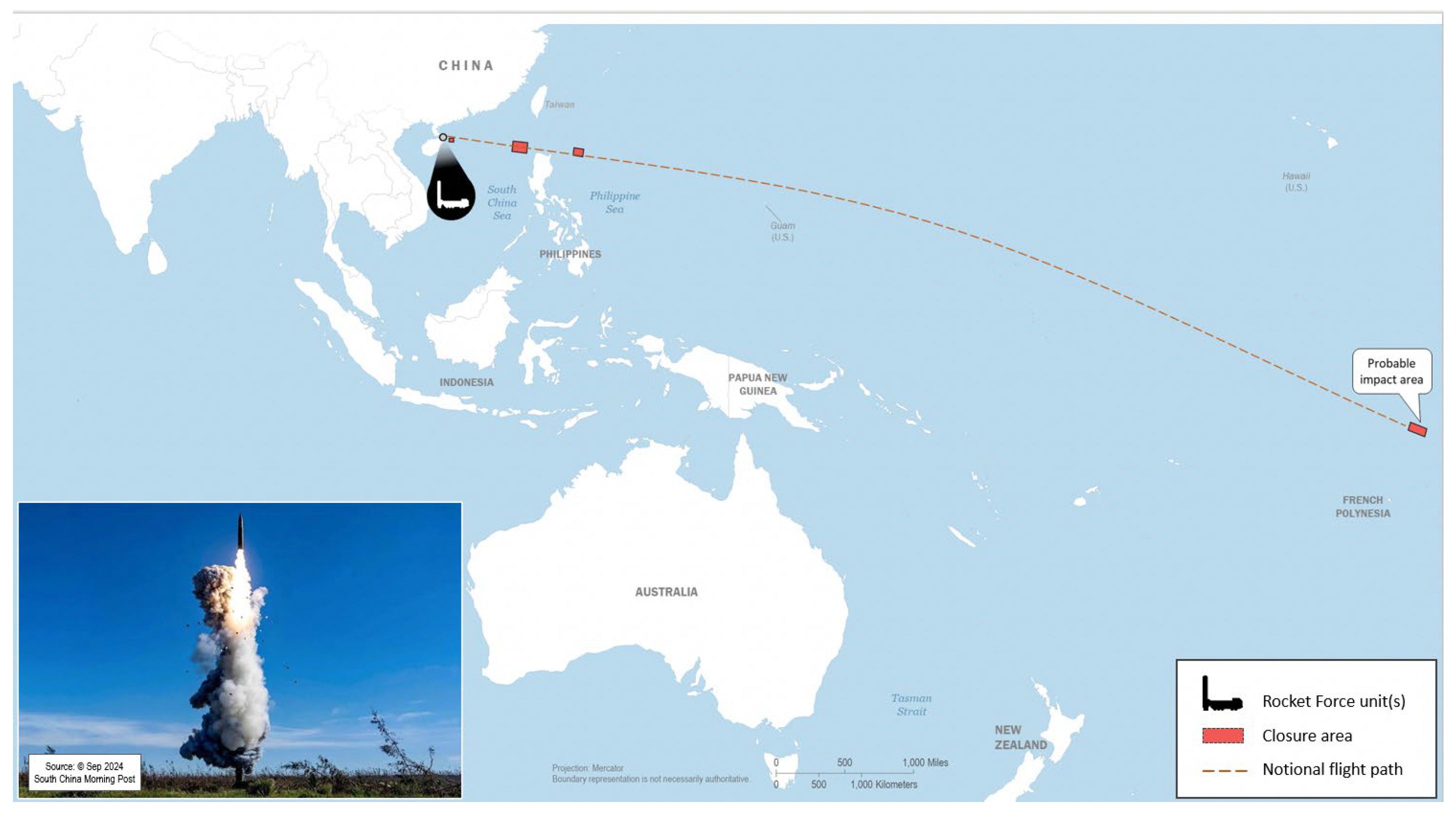 Meanwhile, in the first such open-ocean test since 1980, on 25 September 2024[6] the PLARF launched a DF-31B ICBM from northern Hainan island, which flew roughly 11,000 km before impacting the Pacific near French Polynesia (as seen in figure on p. 29, reproduced above). “The PLA views ICBM launches, including into broad ocean areas during crisis or conflict, as an option for medium-to-high intensity nuclear deterrence operations,” the report judges. “The September 2024 launch probably enabled the PLA to train on the procedures and tactics for this type of operation during peacetime.” It posits that “future launches may occur with some regularity.” Beijing explicitly portrayed the launch as part of routine training but provided pre-notification only to select states.