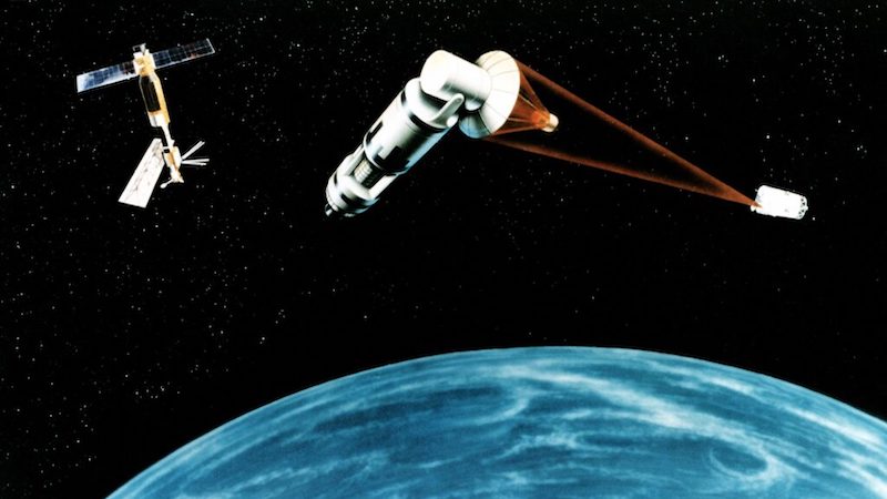 SDI codified U.S. policy in space. After decades of seeking to carve out a passive role for satellites, and therefore pushing the Soviets to agree to peaceful use of space, the Reagan administration pushed forward with an ambitious plan to overtly defend U.S. territorial interests with space-based assets. The Reagan administration’s pursuit of space-based missile defense was controversial – and continues to be to this day. However, the investments made in rocket technology has contributed to the development of the technology that has revolutionized space flight over the past decade. The basic idea of SDI was to build missile interceptors in space, capable of tracking and then striking missiles while they are being boosted into space. The program would require a radical leap forward in technology and major advances in rocketry to bring the cost of launch down considerably. The basic challenge with SDI is that the number of satellites required to protect the United States is considerable and the cost to launch each satellite also very high.[12] This made the project infeasible from an economic standpoint and the technology required was simply not mature enough during the program’s lifetime to deploy the entirety of the system.