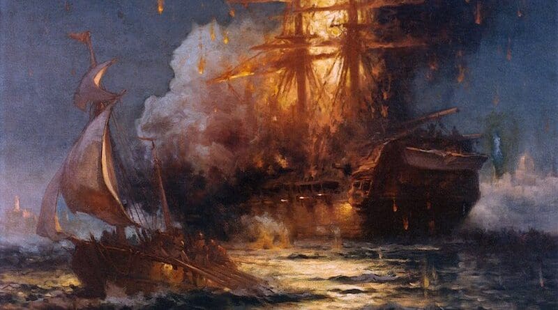 An 1897 painting of the burning of the USS Philadelphia. Credit: Wikipedia Commons