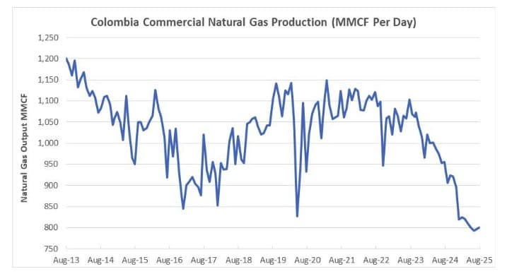 Government data shows Colombia’s natural gas production for August 2025 plunged 16% year over year to 800 million cubic feet per day. The severity of this sharp decline is highlighted by Colombia’s current natural gas production being at its lowest level in over a decade and around 33% less than 2013 natural gas output, as shown below.