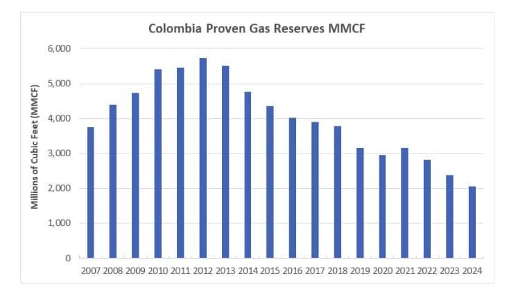 Colombia is experiencing a severe energy crisis driven by a significant decline in natural gas production, which has reached its lowest level in over a decade, and rapidly depleting proven natural gas reserves.