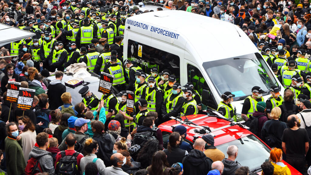 Protesters on Kenmure Street surrounded an Immigration Enforcement van to stop it from leaving, in a large, organic action that was eventually successful © Andy Buchanan / AFP