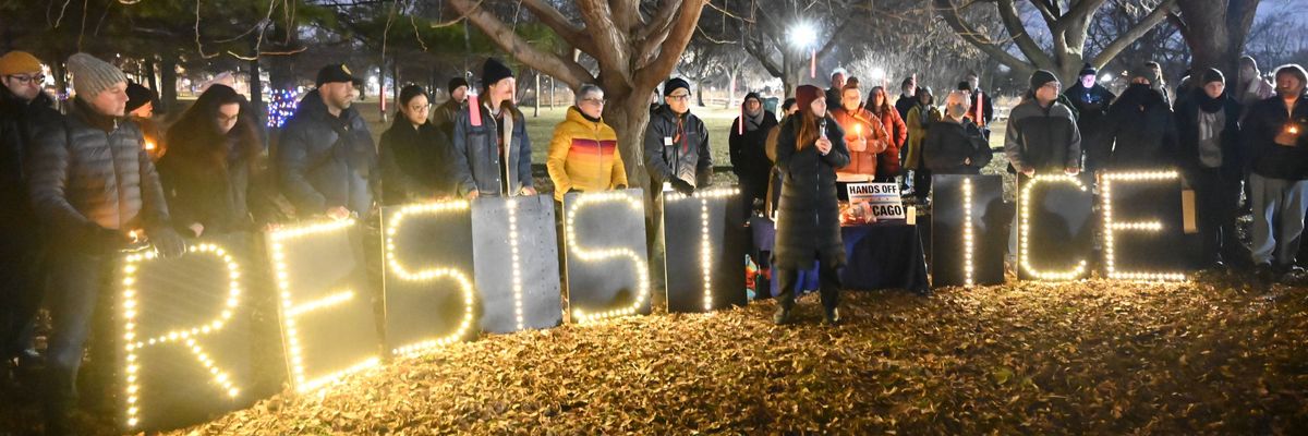 Demonstrators hold candles during an emergency vigil organized by the Ward 40+ Community Response Team at Winnemac Park in Chicago, Illinois, United States, on January 7, 2026 to mourn a rapid responder reportedly killed by an ICE agent earlier the same day in Minneapolis and to protest Immigration and Customs Enforcement (ICE) operations.
