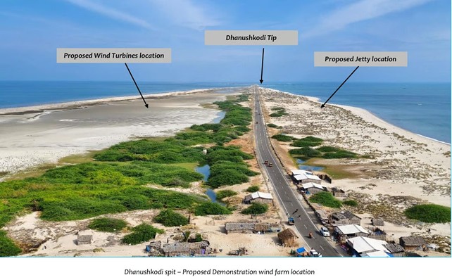 The National Institute for Wind Energy (NIWE) has identified a test facility for testing wind turbines in Dhanushkodi, the southern tip of Pamban island, in Ramanathapuram district. The facility is spread over 75 acres, with intended installation of four turbines to generate 50 megawatts (MW), for studies and data, at a cost of Rs 350 crore. About 70% of the cost is towards the pile foundation. The mast in offshore wind installations is at least 100 metres, with 50 metres of it below the seabed.