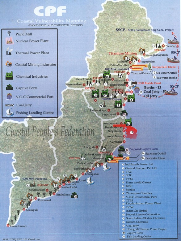 Map showing proposed and existing projects along the Tamil Nadu coast. Source: Coastal Peoples Federation, Nagercoil.