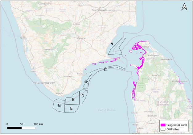 It is quite obvious that the locations for the offshore wind energy projects lie close to, or within, the Gulf of Mannar and Palk Bay regions, which host a multitude of vulnerable, endangered and threatened marine and other species. In addition, the coastal length used for fisheries in Tamil Nadu runs parallel to the project sites.