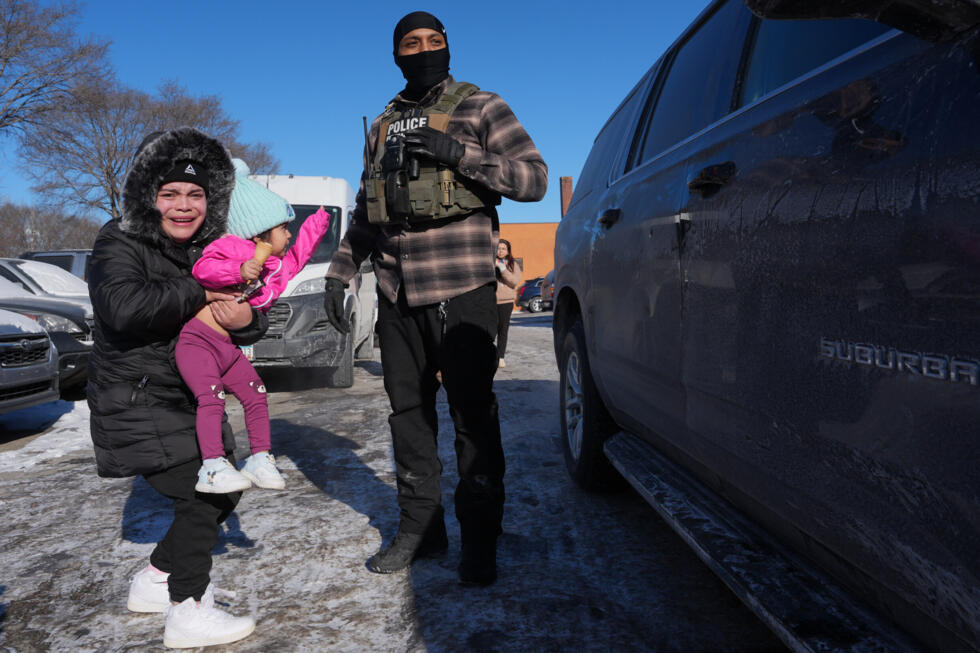A federal immigration agent questions a woman holding a child on Tuesday, January 27, 2026, in Minneapolis. © Adam Gray, AP