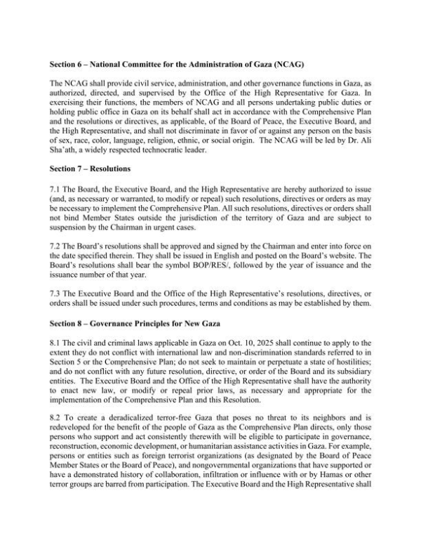 While the resolution states that “no one will be forced to leave Gaza” and that “those who wish to leave will be free to do so and free to return to Gaza,” it also makes clear that access to resources, aid, and political participation in Gaza will be conditional on compliance with the “Comprehensive Plan” and the authority of the Board.