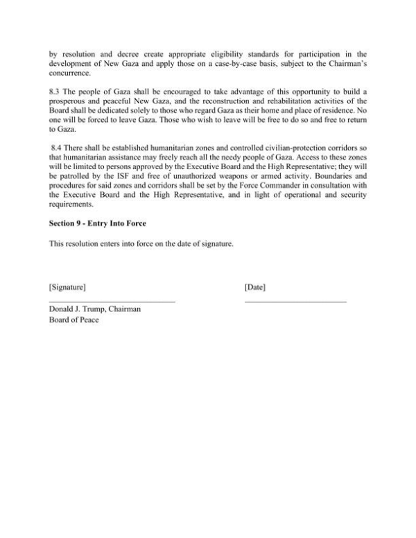 The copy of the document obtained by Drop Site is unsigned. A blank space is left for the signature of Donald J. Trump, in his capacity as Chairman of the Board of Peace. It remains unclear whether the resolution has been formally adopted, or whether the version received reflects a final text.