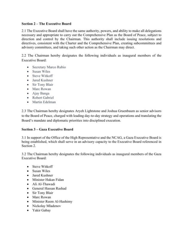 The resolution lists the nine members of the executive board: seven that were already announced by the White House on January 16, plus two more who have not been publicly named. The previously announced members are: Secretary of State Marco Rubio, Special Envoy Steve Witkoff, former UK Prime Minister Tony Blair, Trump son-in-law Jared Kushner, businessman Mark Rowan, World Bank President Ajay Banga, and Deputy National Security Advisor Robert Gabriel. The two new names revealed in the document are Trump’s chief of staff Susan Wiles and Martin Edelman, a real estate attorney and a special advisor to the government of the United Arab Emirates.