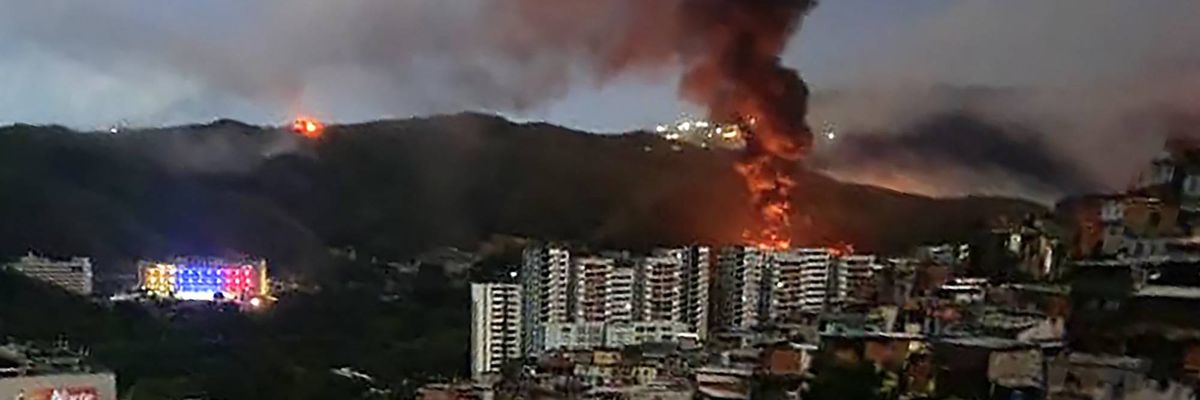 Fire at Fuerte Tiuna, Venezuela’s largest military complex, is seen from a distance after a series of explosions in Caracas on January 3, 2026.