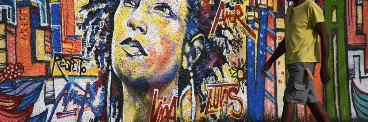 A man walks past a graffiti depicting Brazilian slain Brazilian councilwoman Marielle Franco, near the site where she was murdered in Rio de Janeiro, Brazil on March 14, 2019.