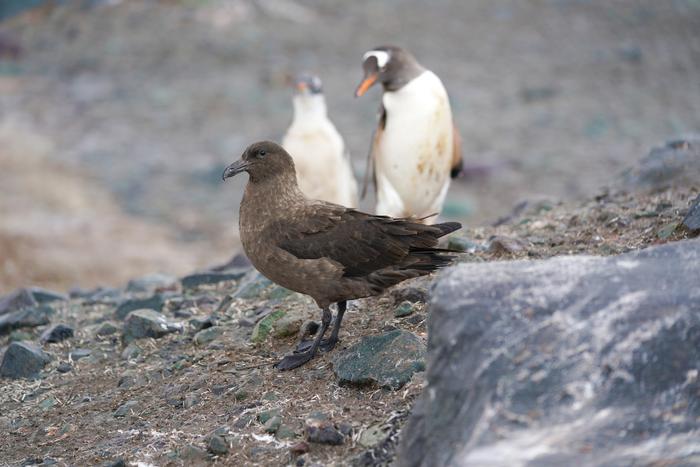A skua stands with some gentoo penguins in the background in Antarctica.