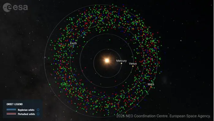 January 27, 2026: Distribution of Near-Earth Asteroids of different taxonomic complexes in the Solar System, where red represents S-complex Near-Earth Asteroids, green represents C-complex ones, and blue represents X-complex ones.