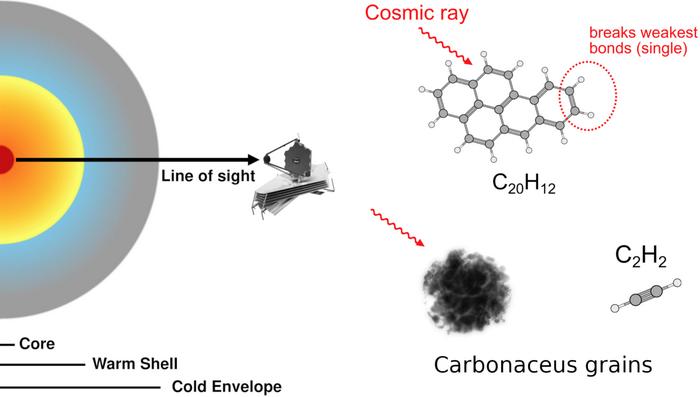 The analysis, involving techniques and theoretical polycyclic aromatic hydrocarbons (PAHs) models developed by the Oxford group, suggests that the observed chemistry cannot be explained solely by high temperatures or turbulent gas motions. Instead, the results point to cosmic rays, abundant in these extreme nuclei, as fragmenting PAHs and carbon-rich dust grains, releasing small organic molecules into the gas phase.
