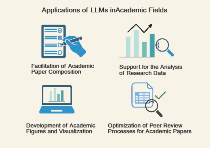 Large language models are predominantly applied in four major academic domains: (1) Research Paper Writing Assistance: LLMs facilitate manuscript preparation through translation services, comprehensive proofreading, and multiple perspective analysis, while simultaneously managing auxiliary tasks such as data organization, thereby substantially enhancing research productivity. (2) Research Data Analysis Support: LLMs exhibit emerging capabilities in dataset compilation, analytical processing, and automated code generation, leading to significant improvements in research efficiency. (3) Academic Visualization Generation: LLMs enhance the traditional visualization process through automated generation of scientific illustrations and data representations, facilitating more effective communication of research findings. (4) Academic Peer Review Support: LLMs contribute to both manuscript self-assessment and formal review processes by providing systematic content evaluation and generating structured review feedback.This figure was created based on the tools provided by Biorender.com (accessed on 20/08/2025)