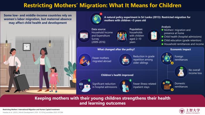 A new study made available online on December 13, 2025, and published in Volume 200 of the World Development journal on April 1, 2026, examines this question by analyzing a migration policy introduced in Sri Lanka in 2013. The policy restricted mothers with children under 5 years of age from migrating overseas for work. By comparing families affected by the policy with those who were not, the researchers assessed its impact on children’s health, education, and household income. The study was led by Associate Professor Takuya Hasebe from Sophia University, Japan, with co-authors Yuma Noritomo from Cornell University, USA, and Bilesha Weeraratne from the Institute of Policy Studies, Sri Lanka.
