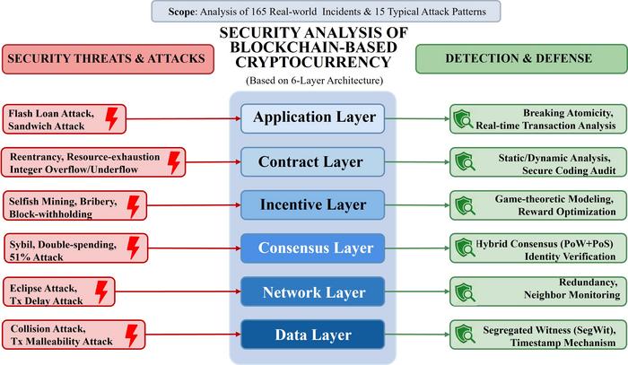 A Six-Layer Hierarchical Threat Taxonomy The study proposes a classification scheme that maps security risks across six logical layers of blockchain architecture. At the infrastructure level, the analysis covers Data and Network Layer threats like Transaction Malleability, Collision Attacks, and Eclipse Attacks, alongside Consensus Layer risks such as 51% Attacks and Sybil Attacks. Moving to economic and logic-based vulnerabilities, the research examines Incentive Layer manipulations—including Selfish Mining, Bribery Attacks, and Block Withholding—where economic loopholes incentivize dishonest behavior. Finally, it addresses the Contract and Application Layers, providing detailed execution logic for smart contract flaws like Reentrancy and Integer Overflows, as well as complex DeFi threats such as Flash Loan and Sandwich Attacks that exploit Maximum Extractable Value (MEV).