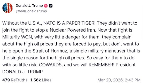 In a post on his Truth Social platform, Trump complained about NATO allies not responding to his call to provide security in the Strait of Hormuz.