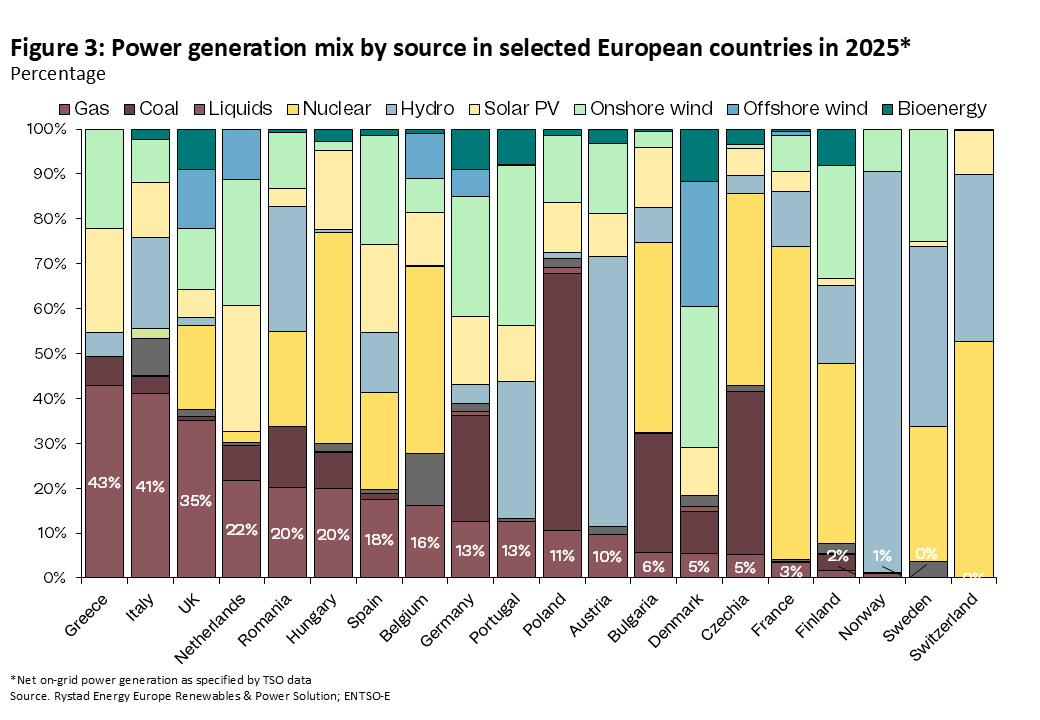 Thanks to its socialist legacy, Poland remains the most dependent on coal in Europe, which accounts for more than 50% of the power generated in 2025. Czechia is in second place, followed by Bulgaria and then Germany. Coal use amongst the remaining EU members remains relatively modest.