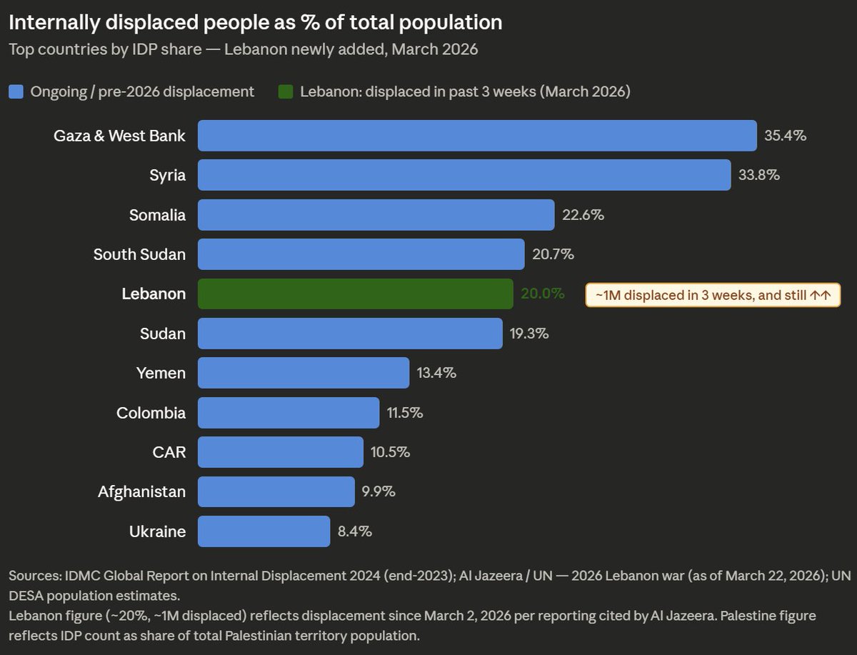 Gaza, Syria, Somalia and South Sudan have all seen larger displacements, ranging from 20% of the population in South Sudan to 35% in Gaza, but Israel has displaced around a million Lebanese, or 20% of the population in just three weeks since the war in Iran broke out three weeks ago, according to figures compiled from UN and IDMC data and cited by Al Jazeera.