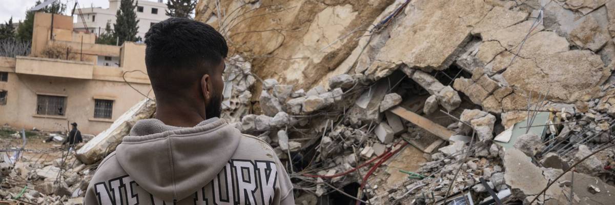 A man walks amongst the wreckage following an Israeli airstrike on March 23, 2026, in Baalbek, Lebanon.