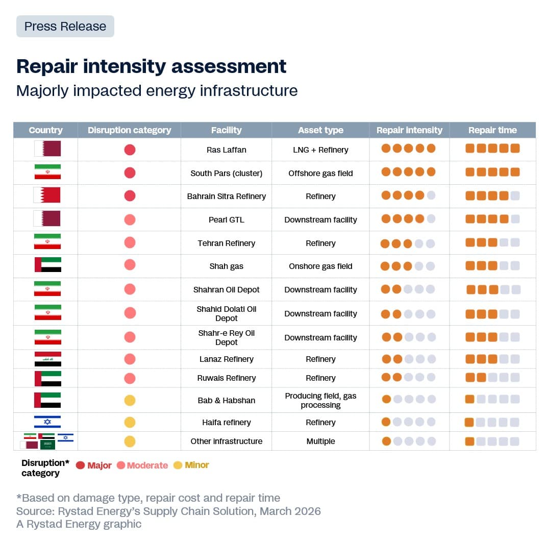 - Qatar’s Ras Laffan stands out as the most serious case, with LNG recovery potentially taking up to five years.