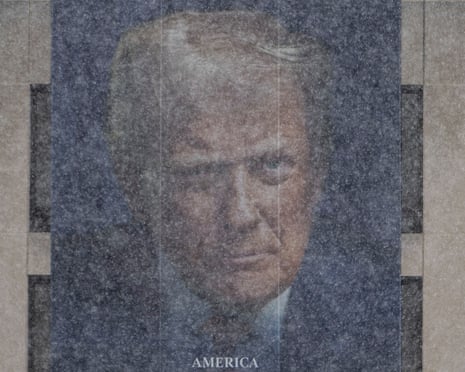A portrait of US president Donald Trump is seen through the snow in Washington, DC, 2 March 2026. Photograph: Andrew Caballero-Reynolds/AFP/Getty Images