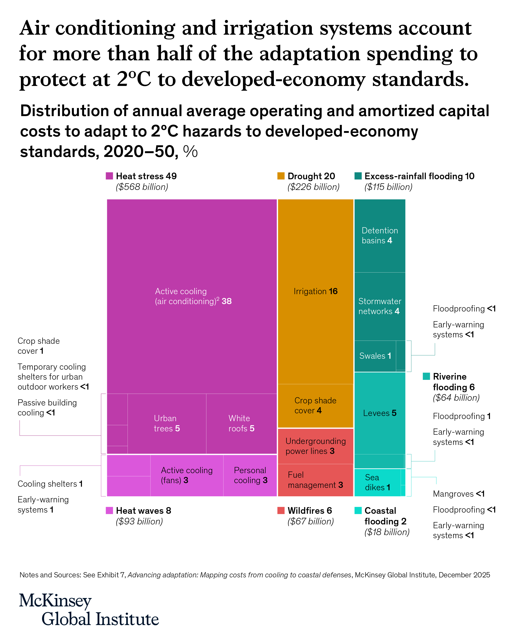 In richer hot countries in the Middle East power is still an issue and as aircon units use a lot of power. Government need to plan for very large increases in power to cool everything from homes to factories as summer temperatures in places like Oman will regularly exceed 50°C in the hottest months. In a recent study, McKinsey estimated that “cooling” will consume 40% of the cost of adapting to the new hot climate in the period 2020-2050, with the need for this spending to become acute from about 2035 onwards as power consumption will start to rise exponentially form then on.