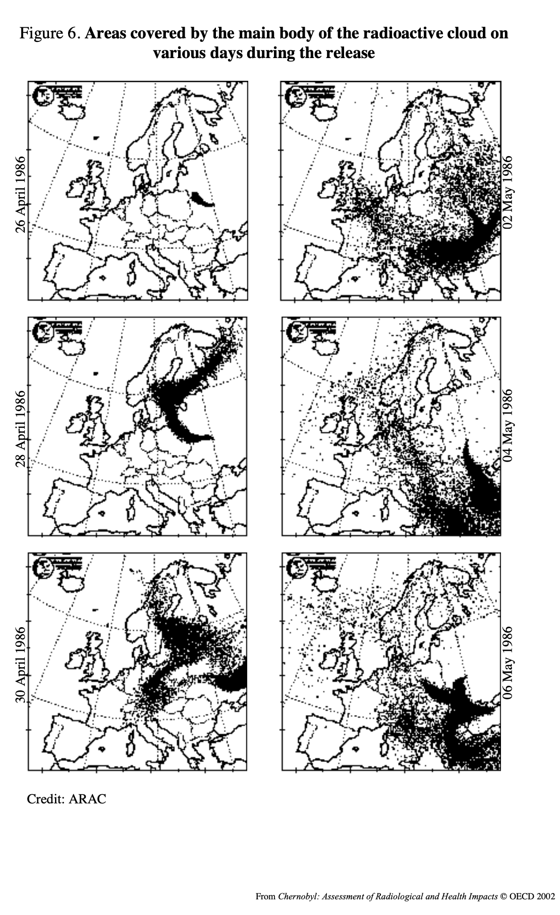 The initial radioactive plume - the one that was detected in Sweden - was tracked as it moved over the Soviet Union and Europe, with north-westerly winds initially taking it towards Scandinavia, the Netherlands, Belgium and the UK. Later, as the winds shifted, the plume moved to the south. All that time, the composition and characteristics of the radioactive materials in the plume were changing, for example due to radioactive decay, chemical transformations, and changes in particle size. The pattern of deposition was also irregular: rainfall caused a significant increase in deposition.