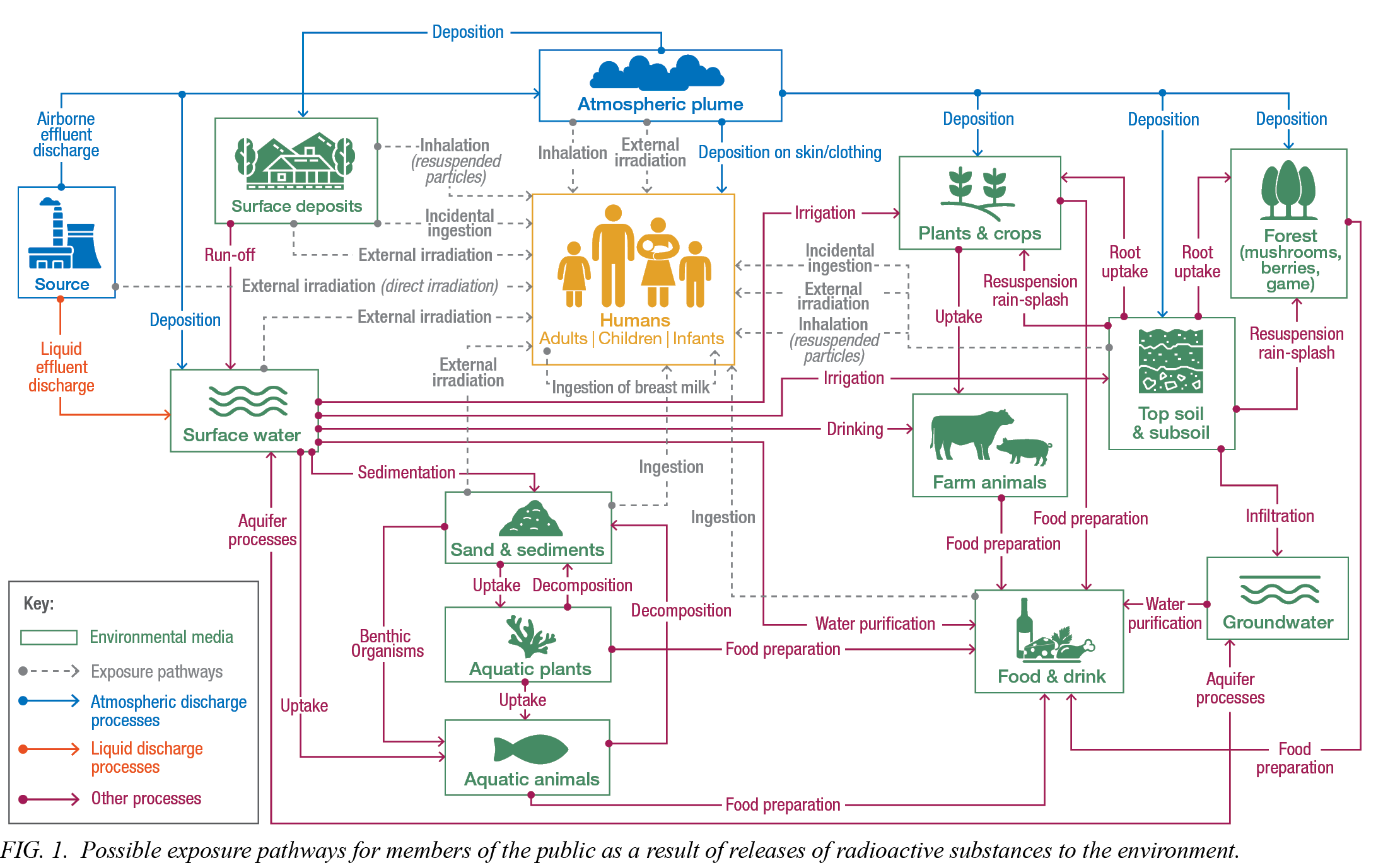 Caesium is longer-lived, with a half-life of 30 years. Deposited on soil, it migrates downwards, and contamination levels in soils decrease only slowly as it is taken up through the roots of plants. And when taken up by plants, it enters the food chain. Here's an International Atomic Energy Agency graphic outlining possible exposure pathways: