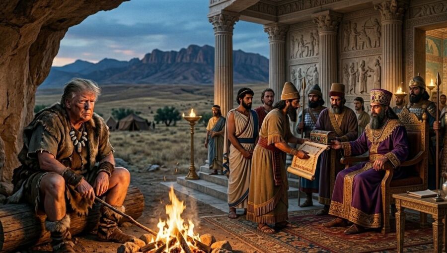 The image showed Trump crouching in animal skins beside a figure resembling an Achaemenid-era Persian ruler holding the Cyrus Cylinder, widely regarded as the world's first declaration of human rights, dating to 539 BC. A second panel depicted Persian nobles gathered in a grand palace while primitive figure of Trump sat around a campfire.