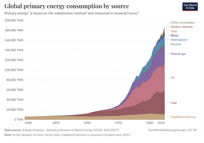 One chart tells the story. Below, courtesy of Our World in Data, is the bleak totting-up of all the energy that humankind has used over the last two and a quarter centuries.