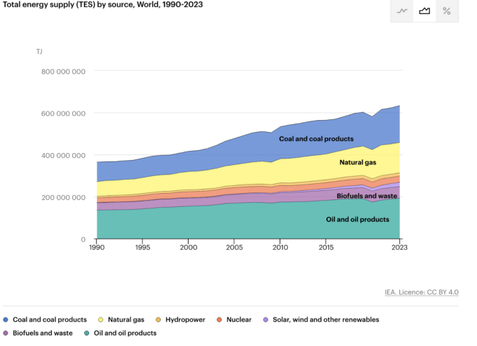 Lest you think I’ve cherry picked my chart, you can find much the same narrative from other credible sources freely available online. Below, for example, is a comparable chart from the International Energy Agency, which shows (in different units, across a shorter span of time, and treating supply rather than consumption) that we are producing roughly one and half times the carbon-based fuel that we were producing just thirty years ago, with no sign of a letup. Squint and you just might see the minutely increasing slice of renewables sandwiched among all that carbon.