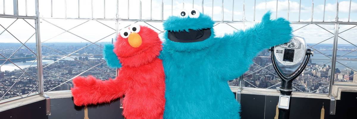 Elmo and Cookie Monster celebrate the return of Sesame Street Live! at the Empire State Building on February 18, 2022 in New York City.