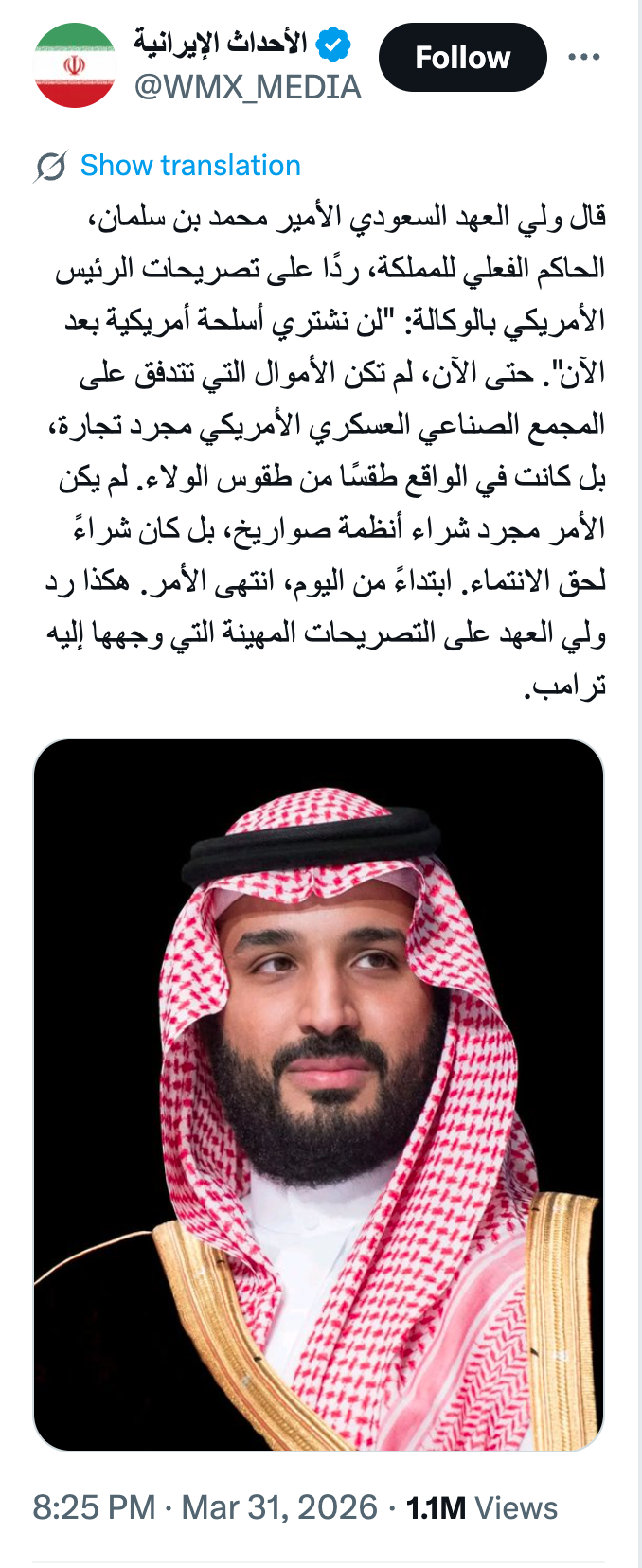 "We will no longer buy American weapons," Mohammed bin Salman said in a post on social media. "Until now, the money that flowed into the US military-industrial complex was not merely a matter of trade, but in reality was a ritual of allegiance. It was not simply about purchasing missile systems, but about buying the right to belong. From today, that is over."
