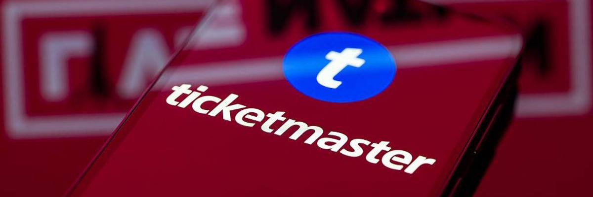The Ticketmaster logo is displayed on a smartphone screen in a photo illustration.