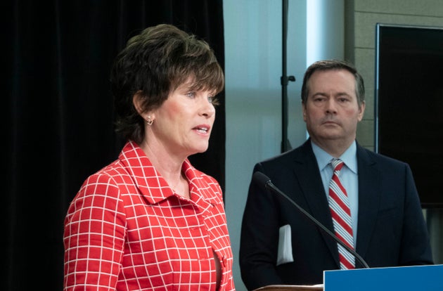 Alberta Premier Jason Kenney and Energy Minister Sonya Savage at a press conference in Edmonton April 24, 2020. Savage recently said the pandemic was a "great time" to build the Trans Mountain pipeline.