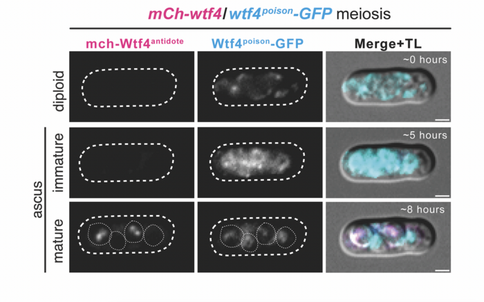 The team also discovered that a particular molecular switch that controls many other genes involved in spore formation also controls the expression of poison, but not antidote, from the wtf4 gene. The switch is essential for yeast reproduction and is inextricably linked to wtf4, helping to explain why this selfish gene is so successful at evading any attempts by the host to disable the switch.