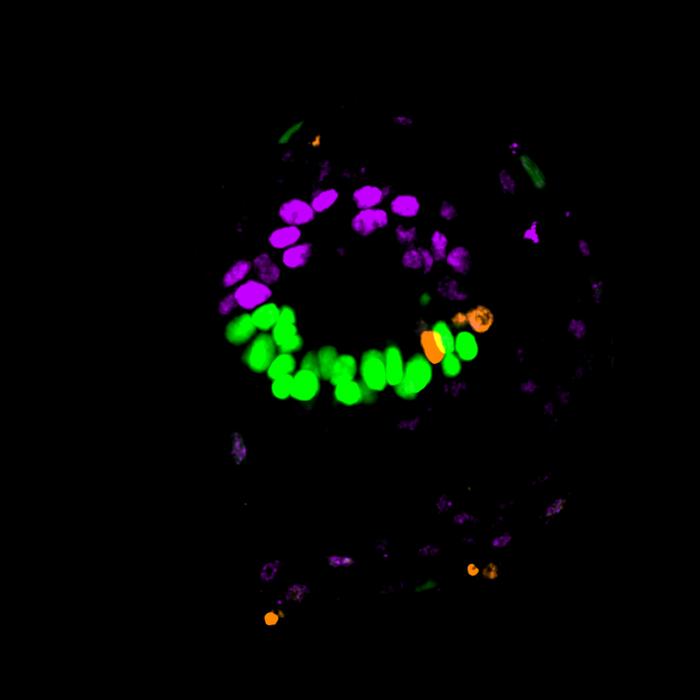 IMAGE: DAY 4 EMBRYOID SHOWING AN INNER EPIBLAST-LIKE DOMAIN MARKED IN GREEN SURROUNDED BY HYPOBLAST-LIKE CELLS MARKED IN ORANGE AND TROPHOBLAST-LIKE CELLS MARKED IN PURPLE. view more