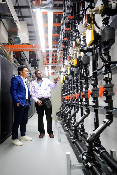 Minister of State for Trade and Industry Mr Alvin Tan (left) toured the new Sustainable Tropical Data Centre Testbed (STDCT) facility at the National University of Singapore (NUS). During the tour, he was shown the manifold wall within the STDCT, which is used for smart monitoring and control of operating parameters for better energy efficiency.