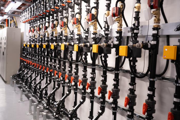 Manifold wall within the Sustainable Tropical Data Centre Testbed for smart monitoring and control of operating parameters for better energy efficiency.