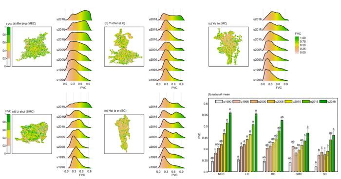 Change characteristics of FVC in new and old urban areas. The FVC of new urban areas is generally higher than that of old urban areas, and this phenomenon is particularly obvious in megacities and large cities. This shows that in the process of urban expansion, the planning and construction of new urban areas pay more attention to ecological balance, while the old urban areas are facing the pressure of reducing the green area. Using case studies of Beijing, Yichun, Yulin, Lishui, and Hailaer (Figure 2), the researchers show the changing trend of FVC from the old urban areas to the new urban areas. The data of these cities show that over time, the FVC of new urban areas gradually shifts to high FVC, a trend that is common in cities of different sizes, although the degree of migration to high FVC decreases with the decrease of city size.