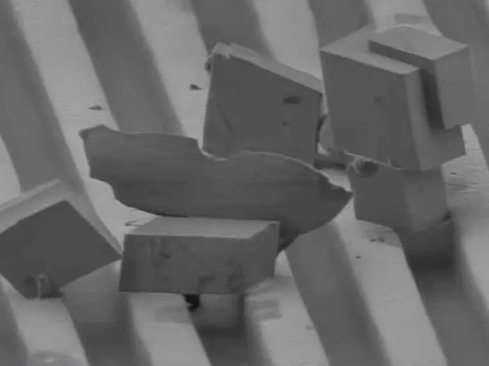 Only a few micrometer-sized lime crystals on the grooved surface under the electron microscope.