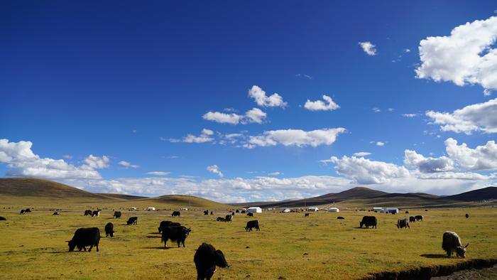 Yaks and tents on an Autumn pasture on the Qinghai-Tibetan Plateau in the northwest of China