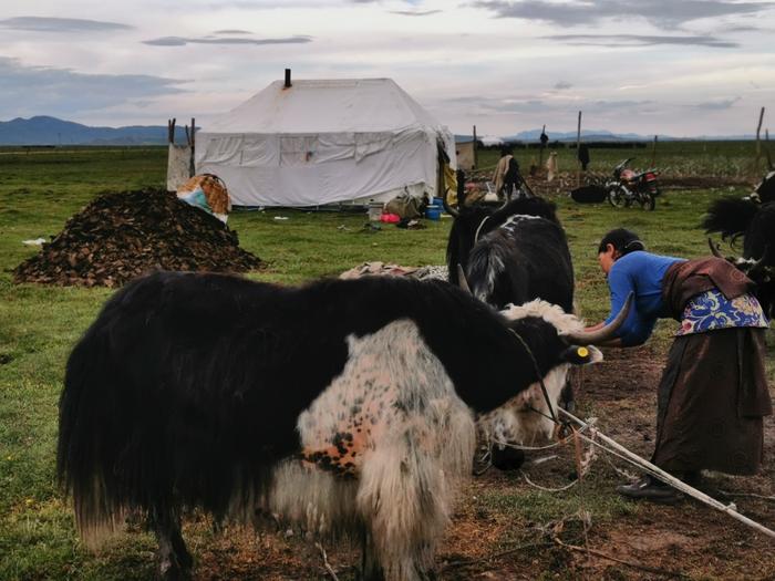 A pastoralist tends to her livestock in front of her tent at dusk on the Qinghai-Tibetan Plateau in the northwest of China