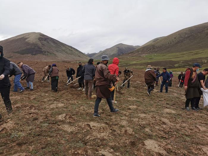 Pastoralists planting grass seeds to restore the degraded grassland on the Qinghai-Tibetan Plateau in northwest China